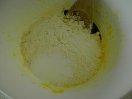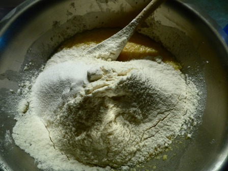 Setacciare la farina e il cacao ed aggiungerli all’impasto gradualmente, alternandolo con del latticello man mano che l’impasto si indurisce, sempre mescolando bene.