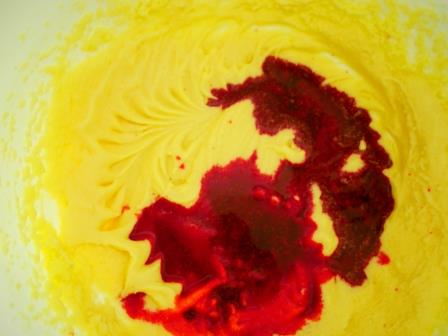Aggiungere anche la vaniglia ed il colorante alimentare, mescolando bene per ottenere un colore vivo e uniforme (io ho utilizzato un cucchiaio di metallo perché il colorante mi avrebbe tinto quello di legno!).