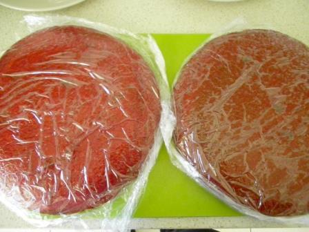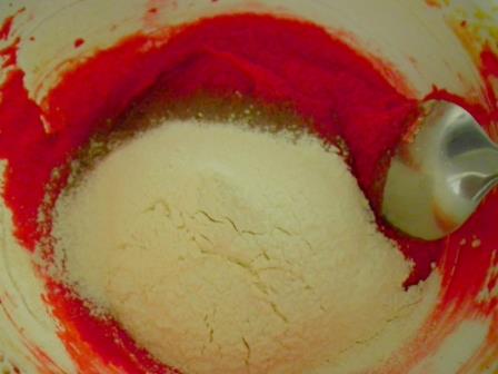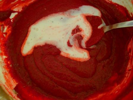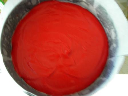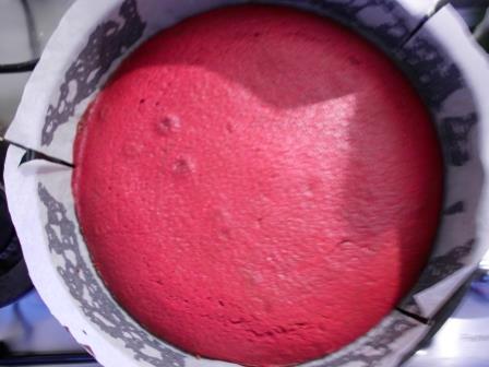Suddividere il tutto nelle due teglie preparate in precedenza ed infornare per circa 30 minuti a 160°C, forno preriscaldato (dopo circa 20 minuti di cottura controllate la torta, perché deve mantenere un colore rosso vivo senza scurirsi!). Prima che le due torte vengano farcite, dovranno riposare per qualche minuto nella loro teglia, poi su una gratella per dolci.