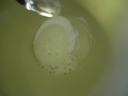 In una ciotolina versare un cucchiaino di bicarbonato e uno d’aceto e, mentre faranno reazione ed incorporare velocemente questa soluzione all’impasto.