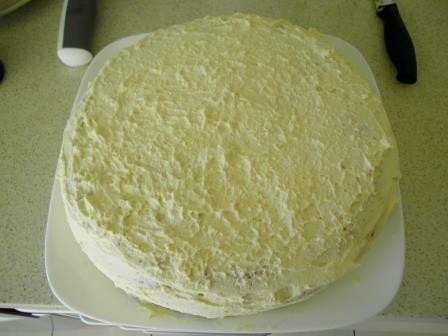 Tagliare le due torte a metà orizzontalmente, farcire ogni strato e disporli precisamente l’uno sull’altro, dopodiché ricoprire il tutto con la crema.