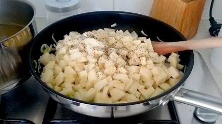 Aggiungere in padella le patate già tagliate e far rosolare per qualche minuto, in modo tale che si crei una crosticina sulla superficie.