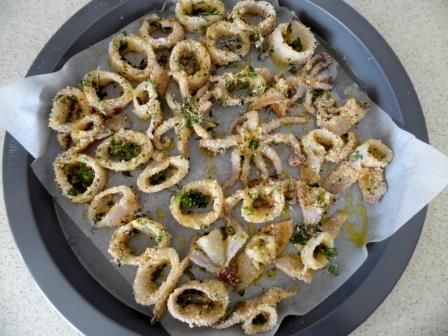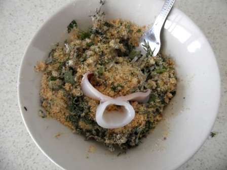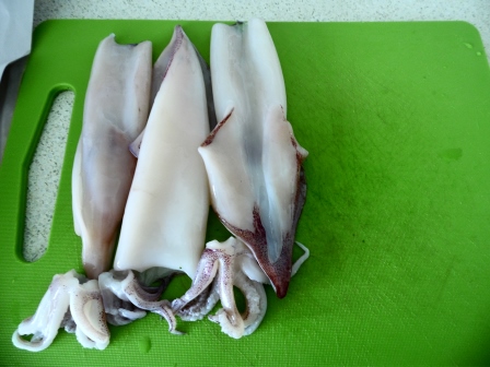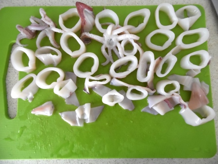 While the vegetables begin to cook, clean the squid removing the outer skin and entrails, then rinse well and cut them into rings.