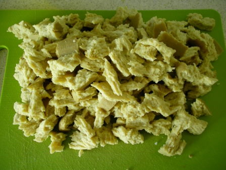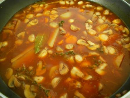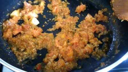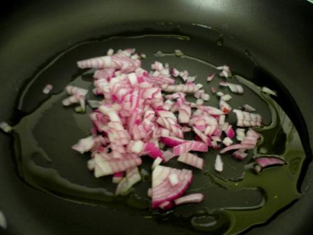 In a large fry-pan heat one or two cloves of garlic to taste with a little oil, which must be sufficient to cook everything (5-6tbsp should be enough).