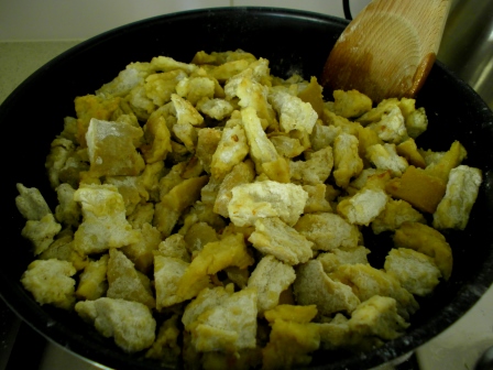 Aggiungere in padella le patate già tagliate e far rosolare per qualche minuto, in modo tale che si crei una crosticina sulla superficie.